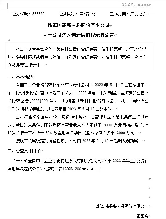 全國中小企業股份轉讓系統有限責任公司于 2023 年5月17 日在全國中小企業股份轉讓系統官網上發布了《關于 2023 年第三批創新層進層決定的公告》(股轉公告[2023]200 號),珠海國能新材料股份有限公司將調入創新層,進層決定自 2...