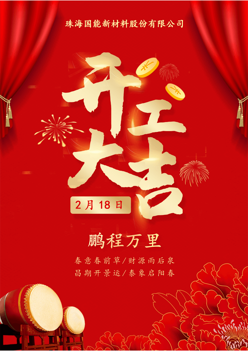 辭舊迎新迎春納福開工大吉今天我們開工啦珠海國能新材料股份有限公司祝大家龍年大吉龍年行大運新的一年取得更大的發展新歲啟封,開工大吉珠海國能新材副總王忠輝向現場的每一位員工送上新春祝福與殷切的開工寄語,為大家鼓舞士氣、鼓足干勁。期待全體員工斗志...